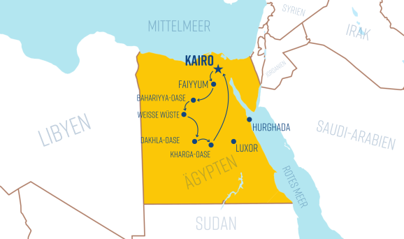 Die Westliche Wüste zeigt sich bei unserer Tour in eindrucksvoller Vielfalt: Von der Metropole Kairo, die sich immer weiter in die Wüste frisst, geht es zunächst ca. 150 km in Richtung Südwesten. Im Fayyum-Becken stoßen wir auf offen präsentierte Erdgeschichte in Form versteinerte Skelette von walartigen Riesensauriern und von Mangrovenwäldern - Relikte eines urzeitlichen Meeres.